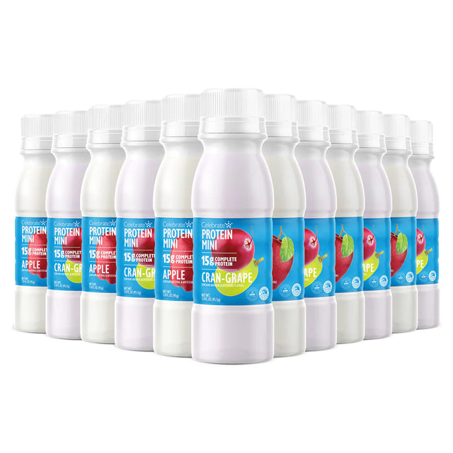 Celebrate Protein Mini 15g Protein Drink provides a powerful 15 grams of complete protein in only 3 ounces! Our protein contains a complete Amino Acid profile to promote muscle repair and growth while helping you feel satiated. This complete protein includes hydrolyzed collagen to help nourish hair, skin, and nails and promote joint health. Our liquid protein shots for bariatric patients are convenient and ready-to-drink. Does not contain any artificial flavors. Available in two bursting with flavor options: Cran-Grape and Apple.
